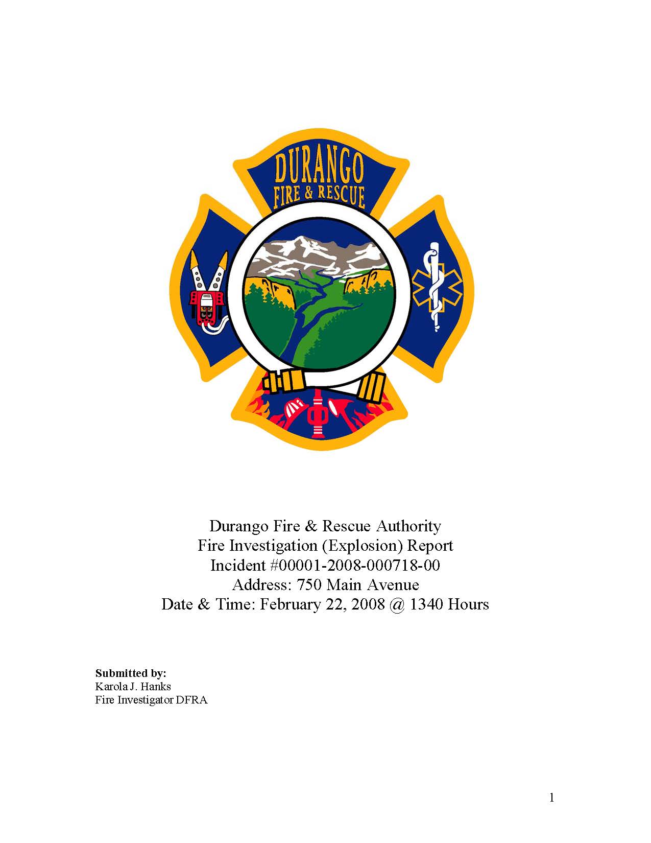 Durango Fire & Rescue Authority Fire Investigation (Explosion) Report Incident #00001-2008-000718-00
